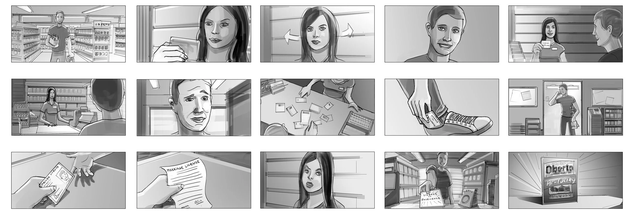 Working with Wexley School For Girls on a commercial for Oberto Jerky. A guy walks into a convenience store to buy some jerky. He needs to prove he's worthy by showing his License To Excellence. All in all the commercial played out remarkably similar to the storyboard sequence except the woman behind the counter was slightly different than Bollywood actress Genelia D'Souza whom I used as a reference for my sketches.