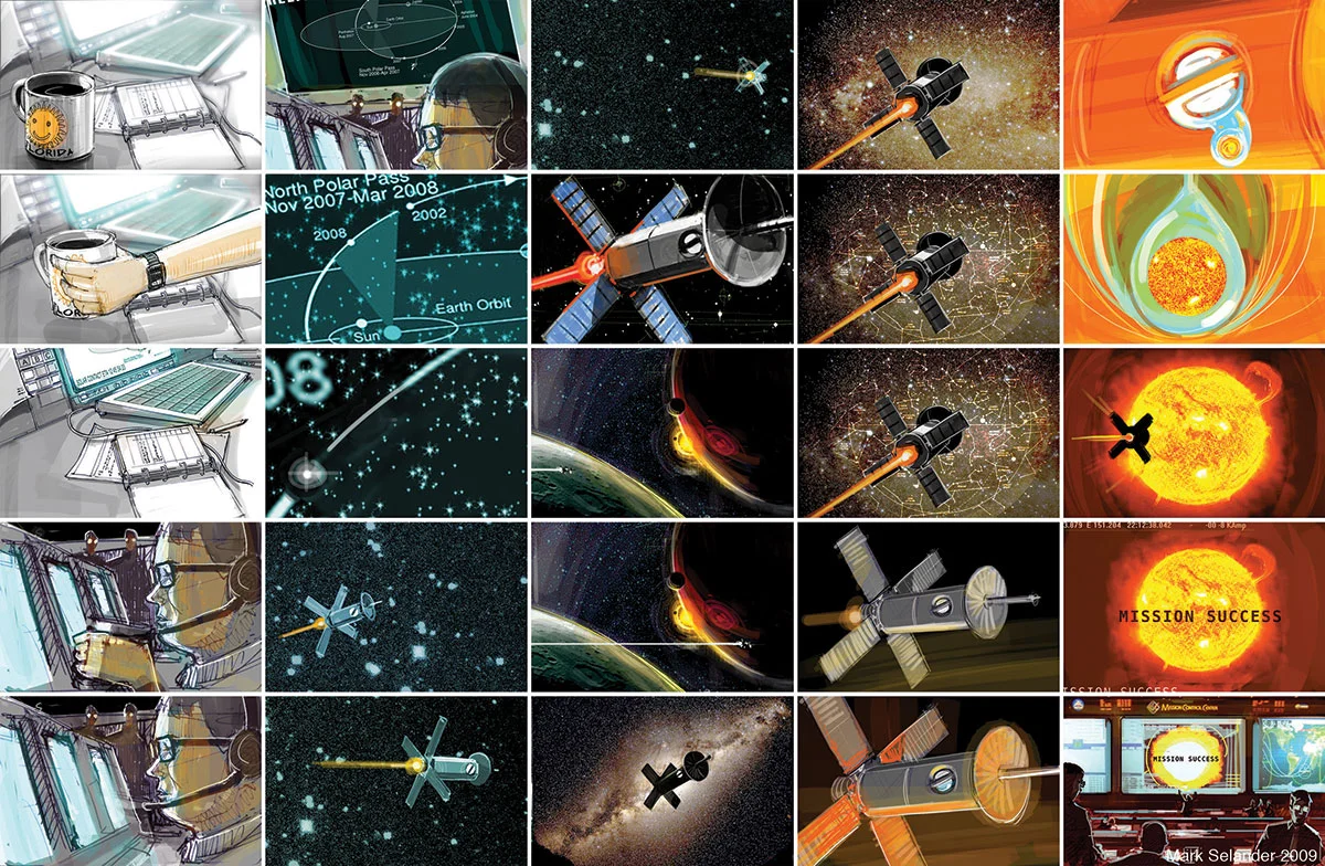 Storyboard sequence for a short film about a solar exploration satellite whose sole purpose is to impact the sun and transmit data back to scientists back home. Along the way it discovers how beautiful the universe is and how fleeting life is before burning up in a sunny inferno. It sheds a tear for the cruelty of it all, and the scientists learn the sun is really really hot. If this was ever made it probably would have won all the awards.